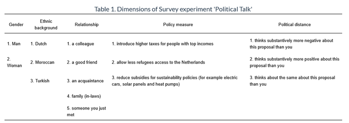 Open political dialogue is regarded as foundational to democratic health and our social fabric. Here, we study political dialogue by examining with whom we prefer to talk about politics and why. In so doing, we develop and test hypotheses about what random encounters (e.g., meeting similar versus dissimilar others, meeting friends or colleagues) foster political dialogue, pose and test conjectures about what features of extended networks facilitate political debate, and present a new unique factorial survey experiment to answer our questions. We incorporated this factorial survey experiment within the NEtherlands Longitudinal Lifecourse Study 2022 (NELLS) and presented to a large sample of Dutch citizens – including Dutch ethnic majority members as well as minoritized Dutch with a Turkish or Moroccan heritage – a choice to engage in political talk or not. Hierarchical linear models reveal that relationship strength, rather than identity similarity (e.g., gender, ethnic), is the primary driver of opting for political dialogue. However, in encounters lacking prior relationship history, gender similarity increases the willingness to engage, and similar political views do relate to engaging in substantive debate modeled dichotomously. Ethnic diversity within extended networks fosters political discussion, while network size has a nonlinear association – medium-sized networks are more conducive to dialogue than very small or very large ones. These findings contribute to debates on political polarization by highlighting the relational conditions that encourage political exchange. Together with the paper we constructed a detailed replication repository/website. Long live Open Science!